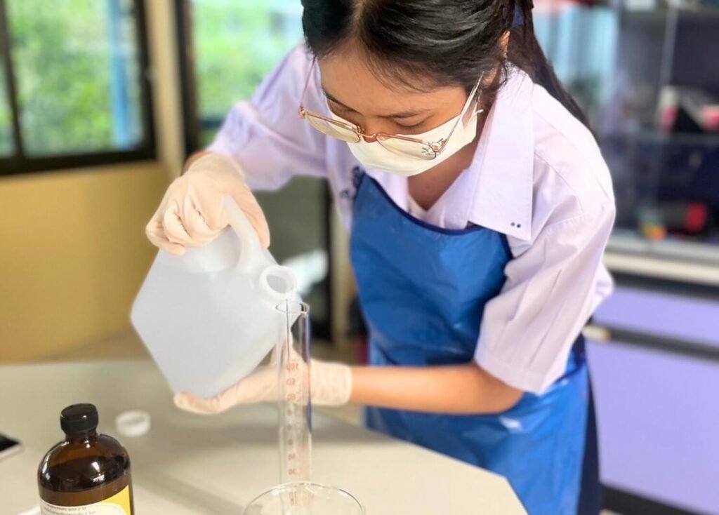 I was one of the students who joined the Science Project Competition, where MEP students from many different schools competed. My teammates and I worked on creating “Plant-Based Leather” from durian husks, aiming to turn waste into a useful, vegan material that could replace animal leather and reduce environmental impact. We designed simple products like AirPods cases and coin purses, and tested the leather’s durability to ensure it was practical.